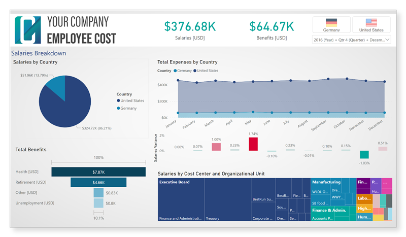 The sample dashboards here have been created with payroll data generated on demand. Payroll data can be from SAP On-premise or from SuccessFactors Employee Central payroll. Please get in touch for a demo.