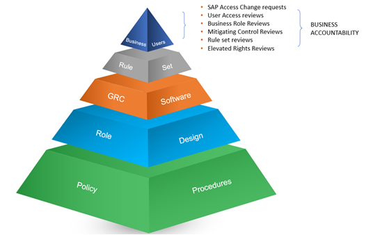 Wenn eine der zugrundeliegenden Komponenten der Pyramide Mängel aufweist, werden diese Compliance-Aufgaben mühsam, ressourcenintensiv und kostspielig. Dies wird die SAP GRC-Fähigkeit des Unternehmens insgesamt beeinträchtigen, da es schwierig sein wird, die Zustimmung der Unternehmen zu erhalten.