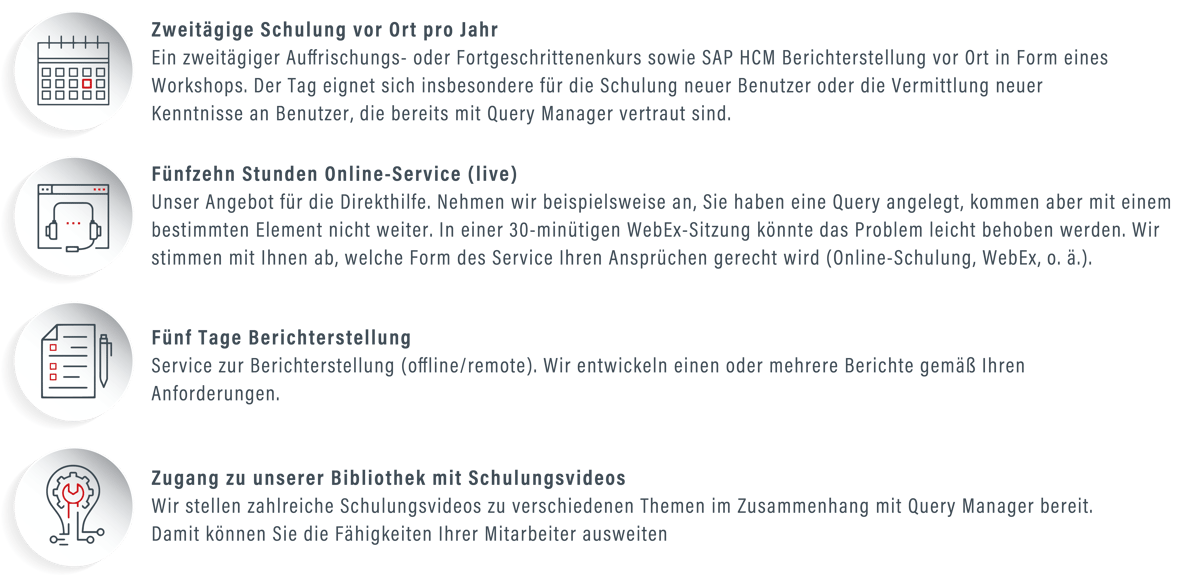 Query Manager verfügt über zahlreiche Möglichkeiten, die aus den verschiedensten Gründen von den Anwendern oft nicht vollständig genutzt werden. Unser Reporting-Service hilft Ihnen dabei, das Potenzial des Query Managers vollständig auszuschöpfen. Der Service ist ein gezielter After-Sales-Plan, der zusätzliche Schulungen und Nachschulungen umfasst.