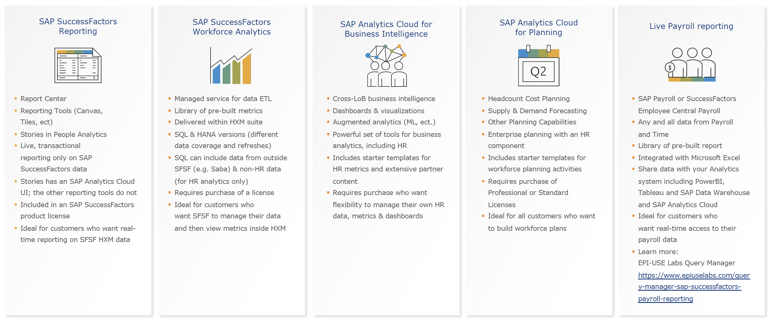 SAP HCM and SAP SuccessFactors HXM customers have integrated reporting, analysis and planning functionality leveraging the five solutions shown in the diagram above, and listed in the table below.