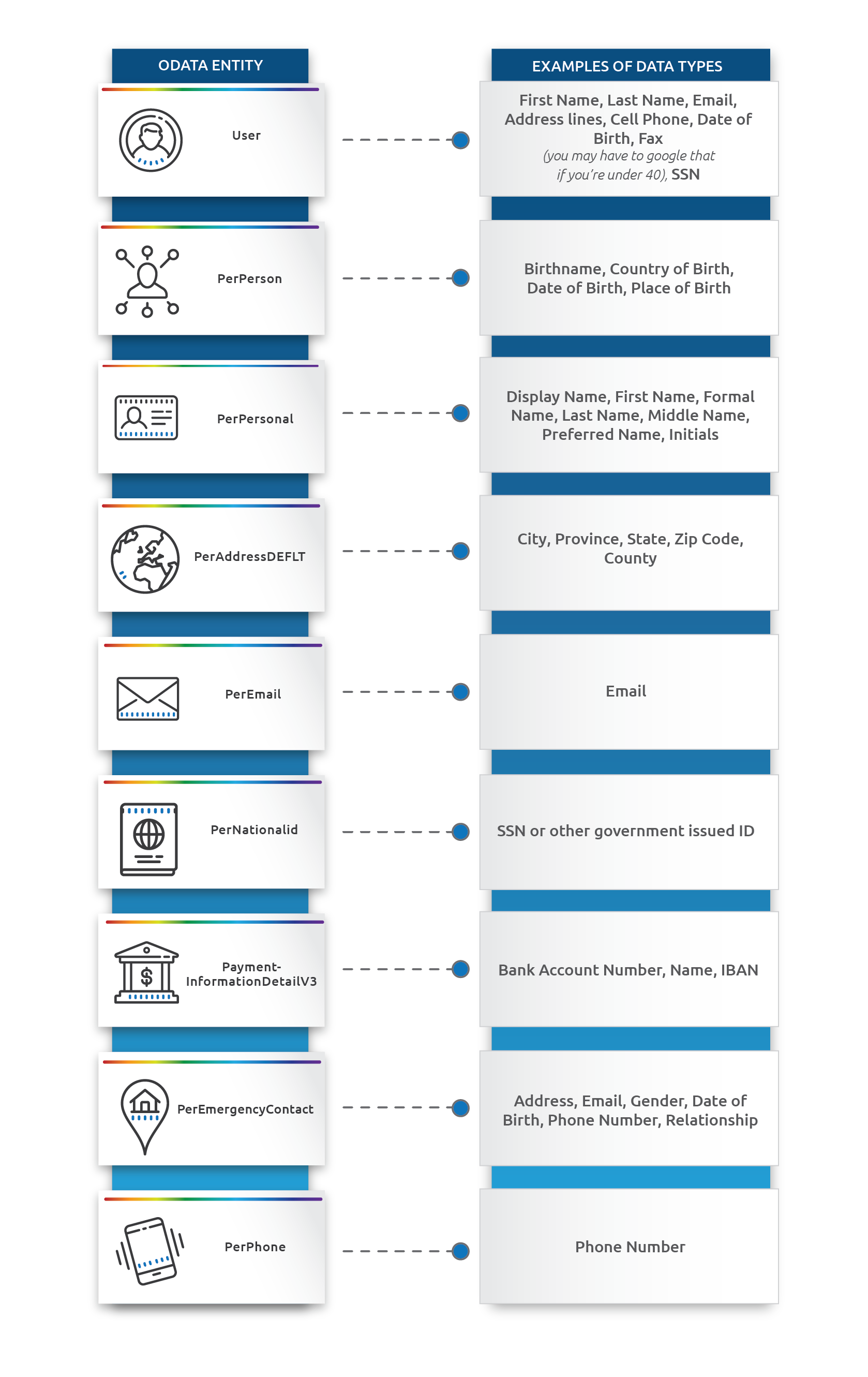 Let's focus now on how to handle sensitive data in an instance which has been refreshed. Immediately, the employee names, addresses, emergency contacts etc. are available in a system which may not have Role Based Permissions which are as tightly controlled. And sometimes these non-production instances are made available to external contractors, or partner organisations, sometimes in remote geographies (creating issues around data transfers). If the data is for a European citizen, can we build legal grounds for using their data for testing purposes? SAP’s own data processing agreement directly states that real data should not be in test environments (read more in our blog). Fortunately, all the standard portlets storing sensitive information are linked to an OData entity which can be leveraged to update the system via an API call.