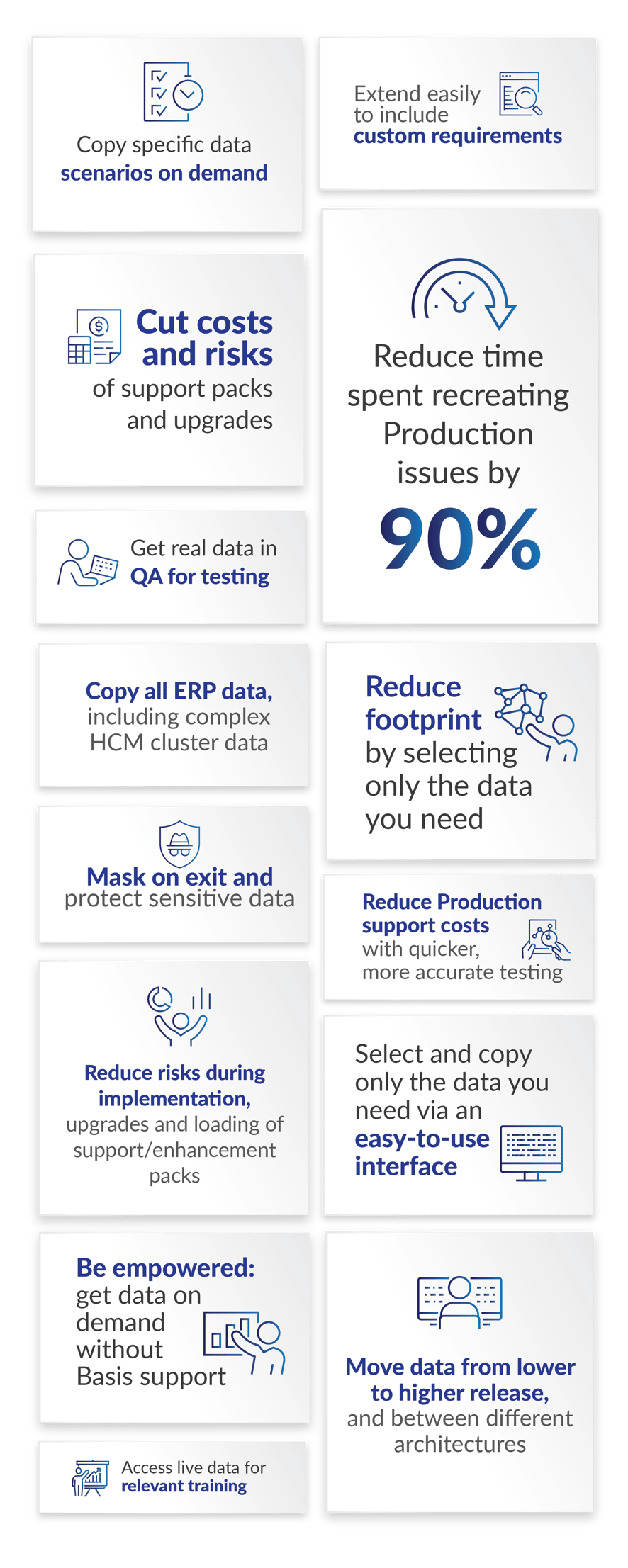 Access to test a specific scenario can be delayed if you depend on IT or an external Basis team for a full non-production system refresh in your SAP system. The alternative of manually recreating the data for testing or training is cumbersome, and might not represent the Production system accurately. To optimise processes, you need to be able to create data subsets for testing, training and Production support.
